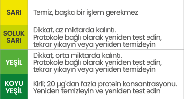 Yüzey kirlendiğinde, swabın rengi değişir. Silinen yüzeyde 20 µg'a kadar protein varsa ProCheck açık yeşile döner. 150 µg'ye kadar mevcutsa, koyu yeşile dönecektir. Kontaminasyonun yoğunluğu aşağıdaki renk skalasıyla karşılaştırılarak belirlenebilir.